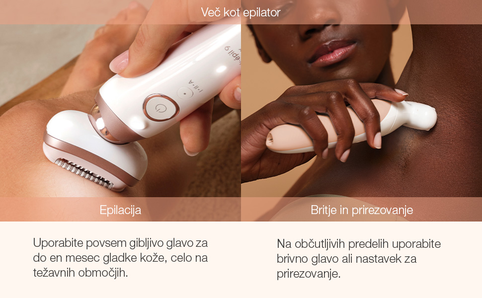 Več kot epilator: vključuje brivno glavo in nastavek za prirezovanje za občutljiva območja.