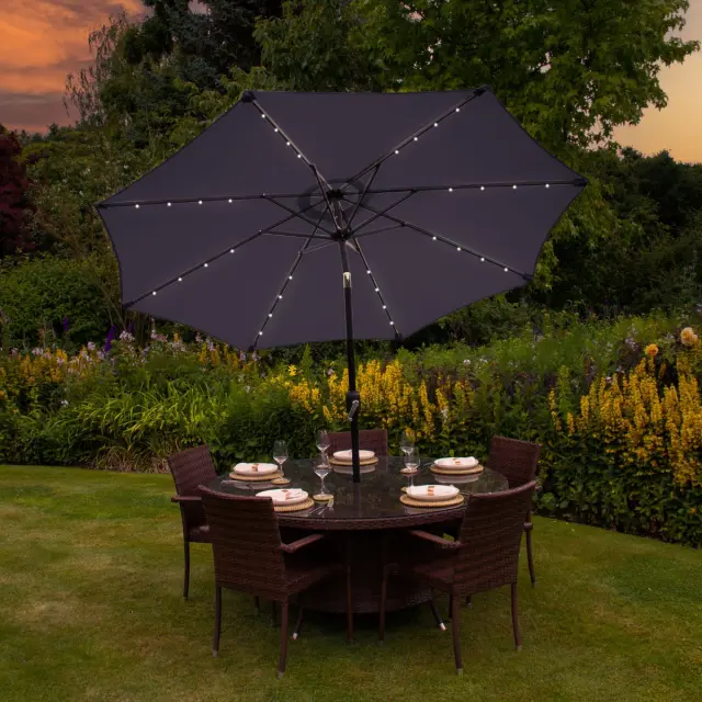 Vsako rebro senčnika je okrašeno s 4 čudovitimi hladno belimi LED lučkami, ki se priročno napajajo s sončno energijo, tako da lahko ob sončnem zahodu svoje poletne večere osvetlite na okolju in finančno prijazen način. Z vgrajenim stikalom za vklop/izklop lahko hitro osvetlite svoj senčnik in še naprej uživate v zunanjih prostorih.