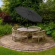 Mehanizem za navijanje ročice pomeni, da lahko senčnik dvignete v hipu in kar najbolje izkoristite te sončne dni. Nato preprosto nagnite do popolnega kota, da dobite pokrov, ki ga potrebujete. Z možnostjo vrtenja za polnih 360 stopinj zagotavlja enostaven nadzor senčenja ves dan, ko se sonce premika. Osrednja zasnova droga omogoča, da se senčnik postavi na sredino mize na terasi, zaradi česar je popoln osrednji del za vsako vrtno zabavo ali večerjo na prostem. Da se stvari lepo ohladijo, je na vrhu strehe diskretna odprtina, ki pomaga boljši pretok zraka. To tudi pomaga pri stabilnosti z zmanjšanjem pritiska vetra.