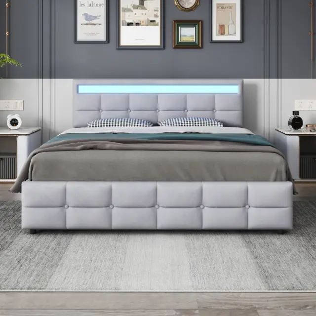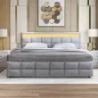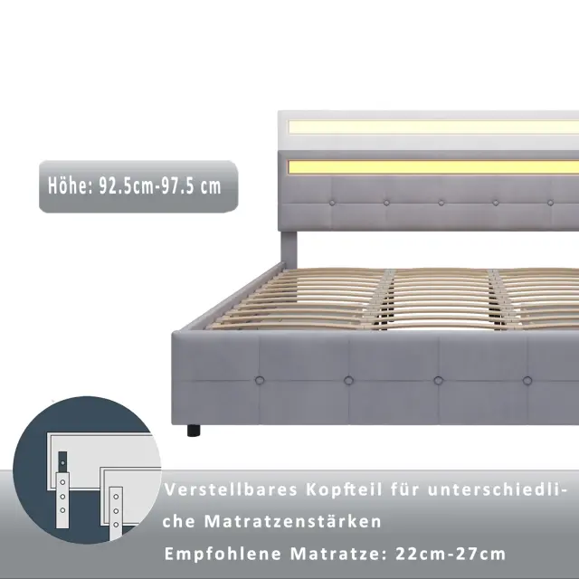 Siv žametni oblazinjen okvir za zakonsko posteljo 180x200 cm z LED vzglavjem, 4 predali in letvenim dnom.