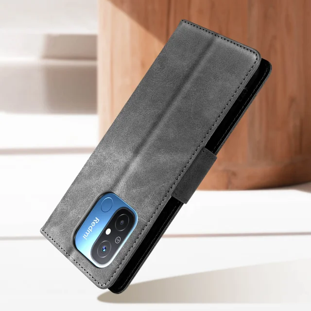 Siva denarnica iz umetnega usnja s podporo za video za Xiaomi Redmi 12C.
