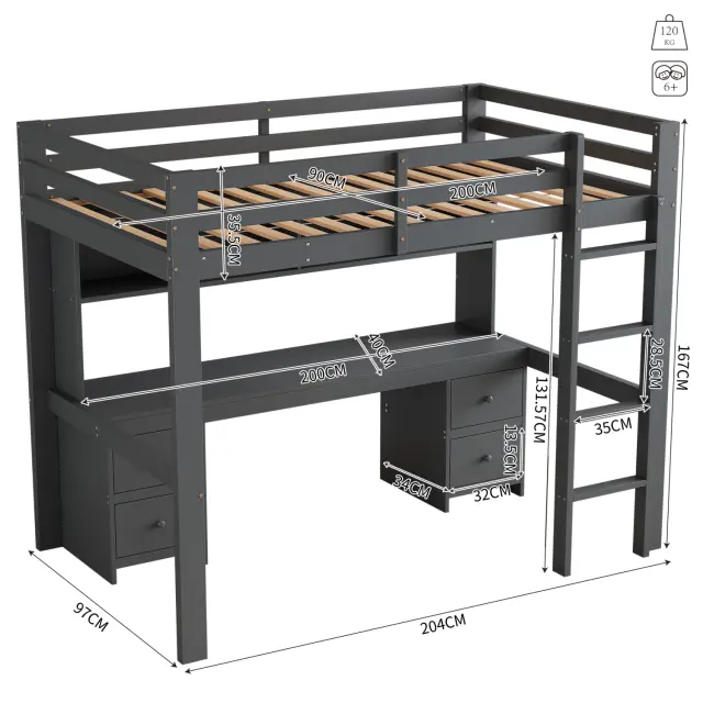 Siva podstrešna postelja (90x200 cm). Borov les. Vključuje mizo in predale. Močna in stabilna. Potrebna je montaža.