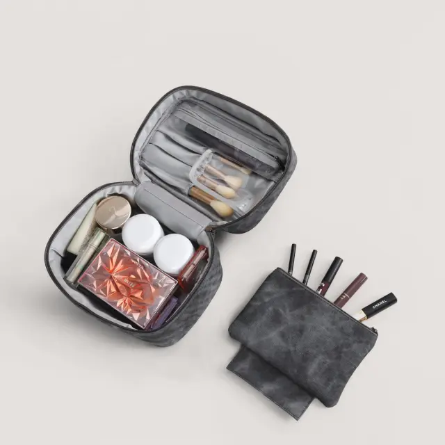 Vodoodporna in zaščitna: Prosimo, upoštevajte: to niso originalni deli. Ta siva PU usnjena toaletna torbica nudi izjemno zaščito za vašo kozmetiko in toaletne pripomočke. Vodoodporna zunanjost ščiti vaše predmete pred razlitjem in vlago, zaradi česar je idealna za uporabo v kopalnicah ali med potovanjem. Dvoslojna zasnova dodatno izboljša zaščito in preprečuje nenamerno puščanje ali poškodbe vaše lastnine. Njena robustna konstrukcija zagotavlja, da vaši predmeti ostanejo varni med vašim potovanjem. Popolna za organizirano in zaščiteno shranjevanje ličil, izdelkov za nego kože in drugih nujnih stvari na poti.