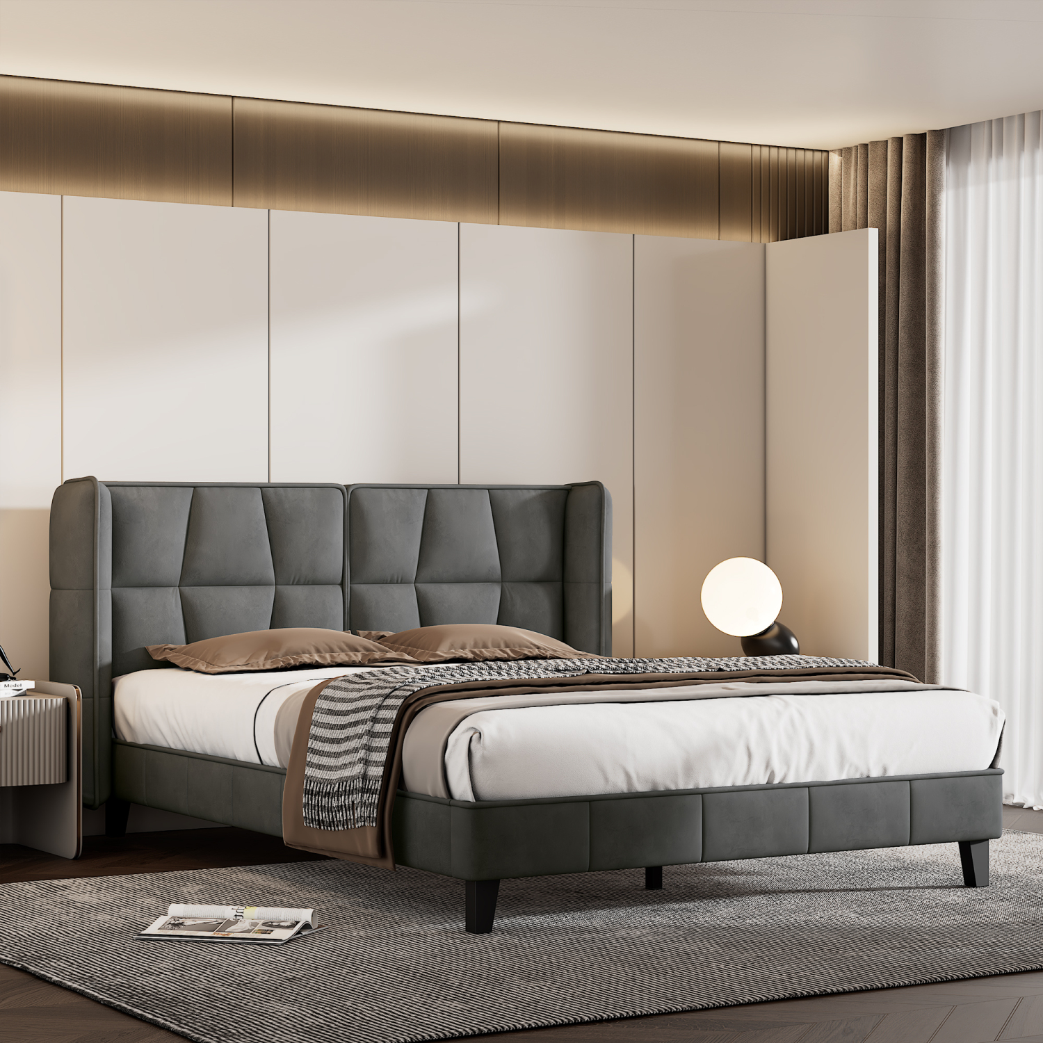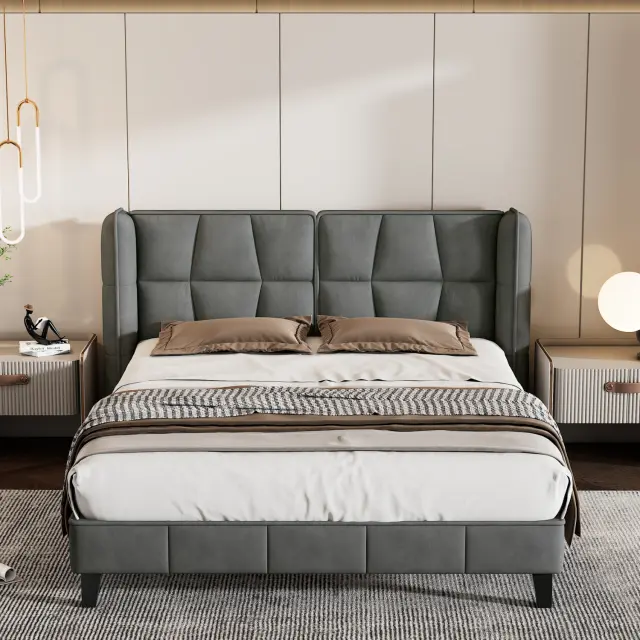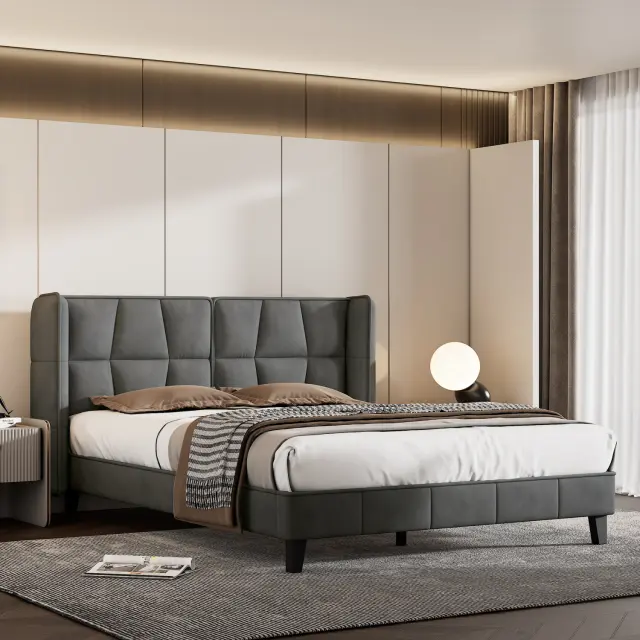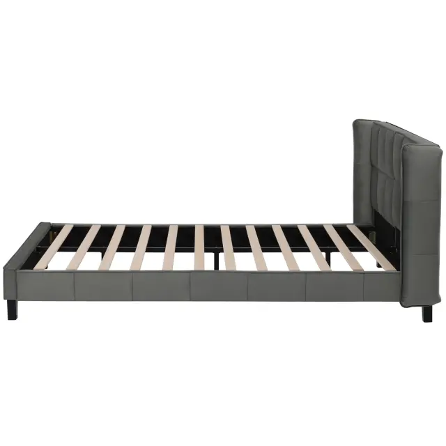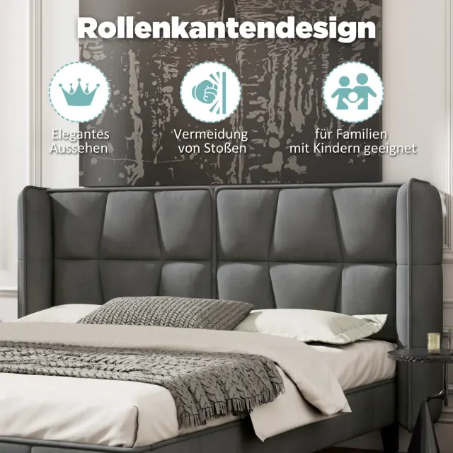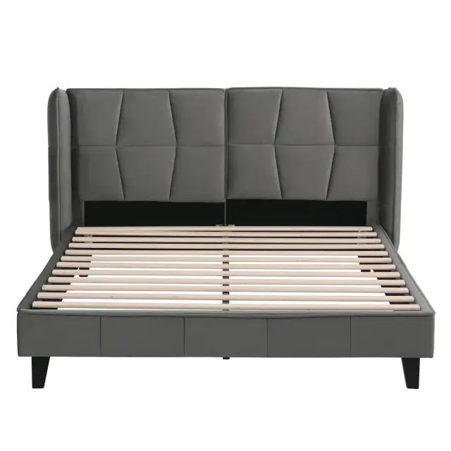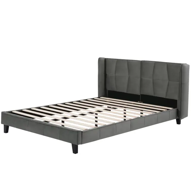 Siva žametna oblazinjena postelja 140x200 z letvenim ogrodjem in vzglavjem, otroška postelja, enostavna montaža.