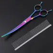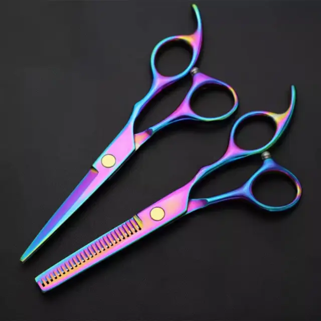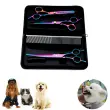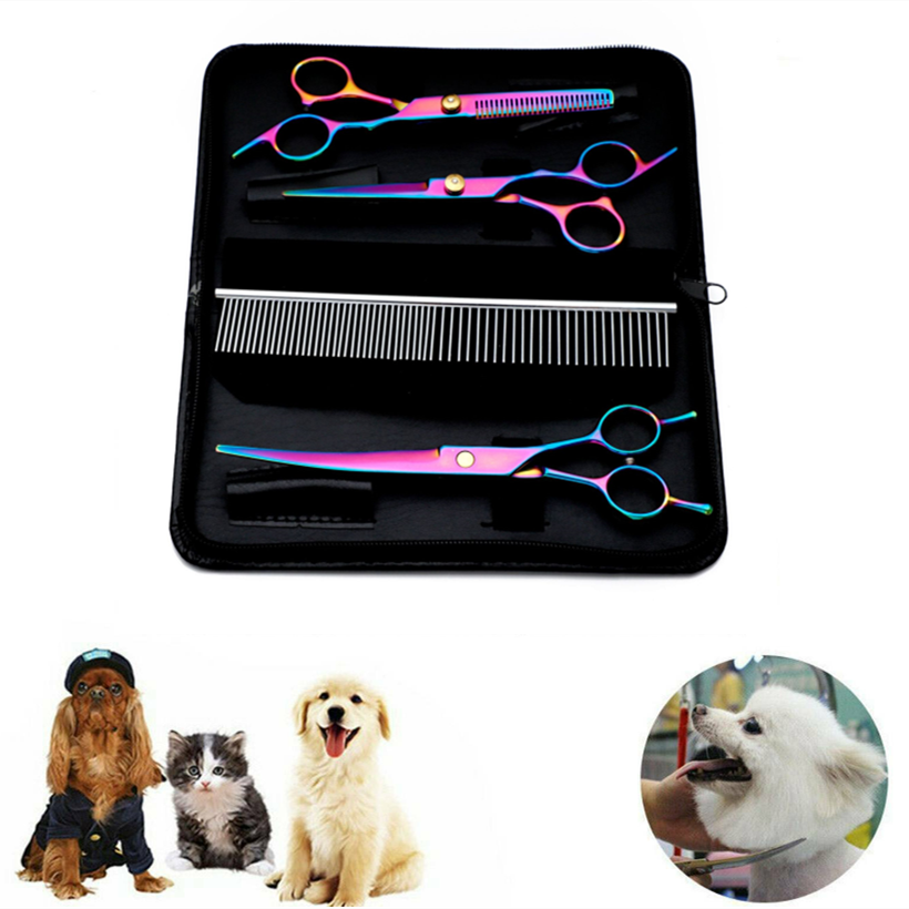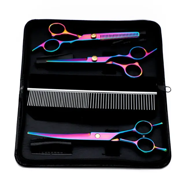 Set vsebuje škarje za prirezovanje, škarje za redčenje, ukrivljene škarje in glavnik s pripadajočim predalom.