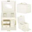Škatla za nakit vam bo omogočila udobno in varno shranjevanje vseh vrst prstanov, verižic, zapestnic, brošk in drugih dodatkov. V naši predstavitvi bo vsak dodatek dobil svoje mesto v kovčku. Zahvaljujoč temu ne boste nikoli izgubili drugega uhana v paru in verižice se ne bodo zapletle. Žametna torbica znamke Springos vključuje številne predelke, v katere lahko organizirate svoje dragocenosti. Kremno črno ohišje se popolnoma zlije z zlato obrobo. Zaradi majhne velikosti je ta organizator popoln za potovanja. Doma je priporočljivo, da ga postavite na predalnik ali toaletno mizo. Naša škatla za nakit: Pomagala vam bo organizirati vaš nakit in olajšala iskanje dodatkov, ki jih potrebujete. Ima ključavnico, ki poveča varnost shranjevanja. Narejena je iz mehkega materiala, zaradi česar je odlična za shranjevanje občutljivega nakita. Parametri: Blagovna znamka: Springos® Material: eko usnje + semiš + mdf Zunanja barva: krem Notranja barva: krem Zlata obroba Semiš notranjost v kovčku Ročaj za prenašanje kovčka Velikost zaprte škatle za nakit: približno 17,5 x 12 x 13,5 cm Zapiranje : s ključem Dodatno: ogledalo znotraj, zapiranje na ključ Mere ohišja: Širina: 17,5 cm Višina: 12 cm Globina: 13,5 cm Notranjost kovčka: 1x ogledalo - 8 x 8 cm 2x odstranljiva predala za uhane - 10,5 x 3,5 cm 1x predal za prstane - 11 x 4,5 cm 2x drsna predala - 10 x 7,5 cm 1x drsni predal za prstane in uhane na navoj Ob straneh: 8x kavljev za ogrlice/obeske 2x žepa iz blaga z gumo Plus: držala za uhane So odstranljive, lahko jih shranite v kozmetično torbico Zapiranje na zaklepanje Ročaj za prenašanje Šifra izdelka: HA1039