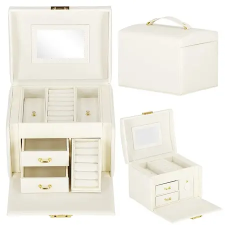Škatla za nakit vam bo omogočila udobno in varno shranjevanje vseh vrst prstanov, verižic, zapestnic, brošk in drugih dodatkov. V naši predstavitvi bo vsak dodatek dobil svoje mesto v kovčku. Zahvaljujoč temu ne boste nikoli izgubili drugega uhana v paru in verižice se ne bodo zapletle. Žametna torbica znamke Springos vključuje številne predelke, v katere lahko organizirate svoje dragocenosti. Kremno črno ohišje se popolnoma zlije z zlato obrobo. Zaradi majhne velikosti je ta organizator popoln za potovanja. Doma je priporočljivo, da ga postavite na predalnik ali toaletno mizo. Naša škatla za nakit: Pomagala vam bo organizirati vaš nakit in olajšala iskanje dodatkov, ki jih potrebujete. Ima ključavnico, ki poveča varnost shranjevanja. Narejena je iz mehkega materiala, zaradi česar je odlična za shranjevanje občutljivega nakita. Parametri: Blagovna znamka: Springos® Material: eko usnje + semiš + mdf Zunanja barva: krem Notranja barva: krem Zlata obroba Semiš notranjost v kovčku Ročaj za prenašanje kovčka Velikost zaprte škatle za nakit: približno 17,5 x 12 x 13,5 cm Zapiranje : s ključem Dodatno: ogledalo znotraj, zapiranje na ključ Mere ohišja: Širina: 17,5 cm Višina: 12 cm Globina: 13,5 cm Notranjost kovčka: 1x ogledalo - 8 x 8 cm 2x odstranljiva predala za uhane - 10,5 x 3,5 cm 1x predal za prstane - 11 x 4,5 cm 2x drsna predala - 10 x 7,5 cm 1x drsni predal za prstane in uhane na navoj Ob straneh: 8x kavljev za ogrlice/obeske 2x žepa iz blaga z gumo Plus: držala za uhane So odstranljive, lahko jih shranite v kozmetično torbico Zapiranje na zaklepanje Ročaj za prenašanje Šifra izdelka: HA1039