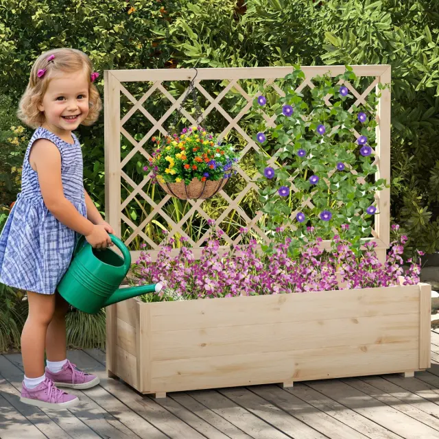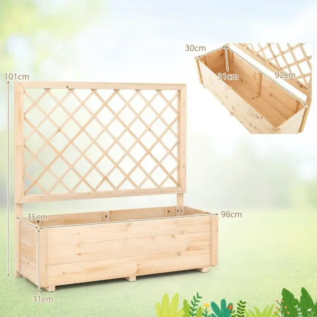 Naša lesena dvignjena greda meri 58 x 35 x 101 cm (D x Š x V), 98 x 35 x 101 cm (D x Š x V), vključno z veliko škatlo za sadike in večnamensko rešetko, ki ne podpira le vzpenjavk, kot so paradižniki in vrtnice, temveč služi tudi kot lep nosilec za obešanje majhnih cvetličnih košar ali okrasnih okraskov, kar vašemu zunanjemu prostoru doda pridih elegance. Na osnovni plošči so tudi drenažne reže, ki pomagajo odvajati odvečno vodo in spodbujajo zračenje za boljšo rast rastlin. Naša vrtna postelja je izdelana iz visokokakovostnega borovega lesa, zato zagotavlja neprekosljivo vzdržljivost in naravno varnost ter je zanesljiva izbira za vaše potrebe vrtnarjenja na prostem. Lesene površine lahko tudi pobarvate ali obarvate v svoje najljubše barve ali vzorce in tako svojemu zunanjemu prostoru dodajte posebno središče.