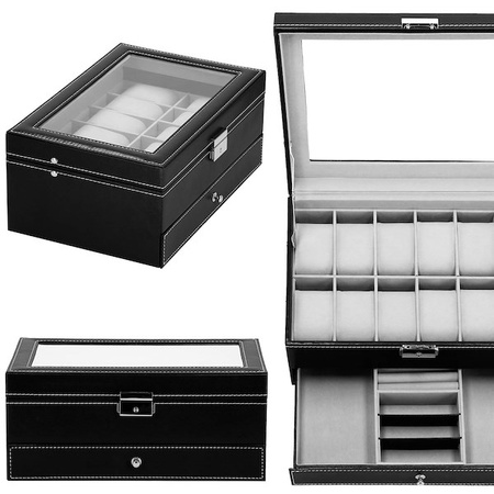Med prednostmi škatle znamke Springos lahko omenimo: Brezčasen dizajn, ki združuje klasično obliko z visokokakovostnimi materiali. Možnost odstranitve blazin in prilagajanja velikosti predelkov glede na vaše potrebe. Raznolikost predelkov za lažje shranjevanje nakita. Parametri: Blagovna znamka: Springos Barva: črna / siva Barva okovja: srebrna Zaključek: šivi Zapiranje: zaponka s ključem Material: umetno usnje / žamet Konstrukcija: MDF Število ur: 12 Material: MDF, umetno usnje, žamet Zunanja barva: črna , z belimi šivi Barva na notranji strani: odtenek sive Vrsta okovja: zaskočna na ključ Okence: da Mere zloženega kovčka: 30 x 20 x 13 cm Dodatno: 2 predelka 9 x 18 cm 1 predelek za prstane 9 x 8,5 cm 1 predelek za uhane/sponke 9 x 8,5 cm Koda izdelka: HA1063