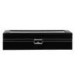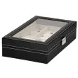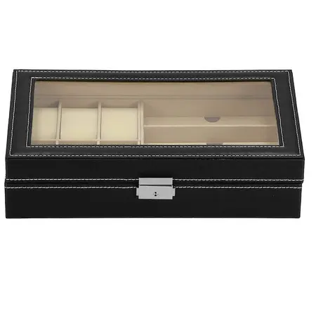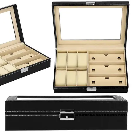Parametri: Blagovna znamka: Springos Material: MDF, sintetično usnje, žamet Zunanja barva: črna, z belo obrobo Notranjost: ton sive Barva okovja: srebrna Vrsta zapiranja: zaponka s ključem Število položajev za ure: 8 Mere ohišja zloženo: 30 x 20 x 8 cm Plus: Ogledalo: 11 x 16 cm 4 držala za verižice in zapestnice, z žepom za vrvico pod 2 predelkoma za prstane, sponke in uhane Zaprt predal z zavihkom Mere predelkov za ure in sponke: 4,5 x 9 cm Mere predala z zavihkom: 9 x 9 cm Šifra izdelka: HA1060