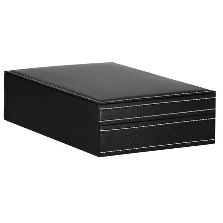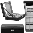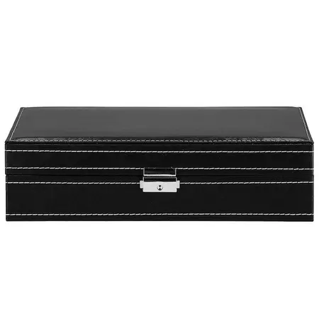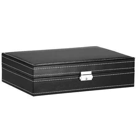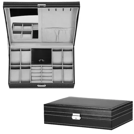 Parametri: Blagovna znamka: Springos Material: MDF, eko usnje, žamet Zunanja barva: črna z belimi obrobami Notranja barva: odtenek sive Barva dodatkov: srebrna Vrsta zapiranja: zaponka s ključem Število predelkov za uro: 8 Mere škatle zložene: 30 x 20 x 8 cm Plus: 11 x 16 cm ogledalo 4 držala za verižice in zapestnice, z elastičnim žepom spodaj 2 predelka za prstane, zanke in uhane Predal zaprt z zavihkom Mere predalčkov za ure in žebljičke: 4,5 x 9 cm Mere predalčka z zavihkom: 9 x 9 cm Šifra izdelka: HA1062