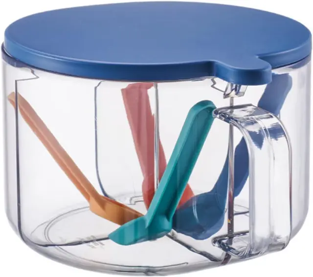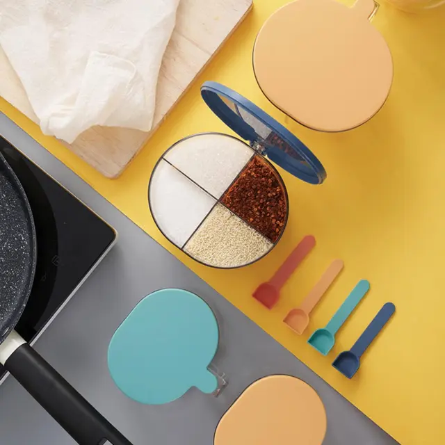 Glavni material je PP, ki ustreza živilskim standardom, ki je varen, neškodljiv in vzdržljiv. Prozoren material vam omogoča, da ves čas veste, koliko začimb je ostalo, in hitro najdete začimbe, ki jih potrebujete med kuhanjem. Ergonomski ročaj je enostaven za držanje, škatlo za začimbe pa je mogoče odpreti z eno roko za enostavno upravljanje.