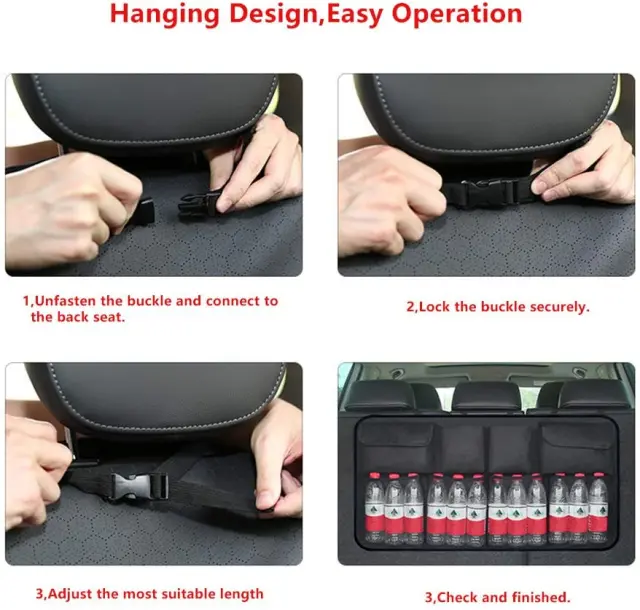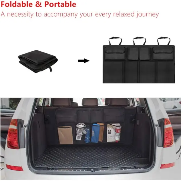Enostavna namestitev: obesi se na zadnjo stran vzglavnika zadnjega sedeža - hitro in enostavno. Zagotavlja dodaten prostor v prtljažnem prostoru, saj omogoča, da se manjši deli prilegajo v žepe, ki visijo proti zadnjemu sedežu. Sprostite celotno nadstropje za torbe, kovčke, torbe na zvitke, nahrbtnike itd. Odlično za dolgo potovanje!