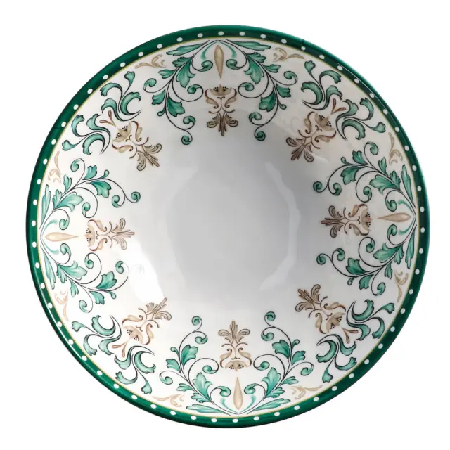 Elegantna skleda Kensy Floral s klasičnim dekorativnim vzorcem v zelenih tonih je popolna za postrežbo solat, sadja ali prigrizkov na prostem. Njen čudovit dizajn spominja na tradicionalno keramiko, vendar je izjemno lahka in odporna, zato je idealna za piknike, kampiranja ali druge aktivnosti na prostem. Izdelana je iz trpežnega melamina, ki je lahek in odporen na udarce. Skleda ni primerna za uporabo v mikrovalovni pečici in pomivanje v pomivalnem stroju. Je odlična izbira za vse, ki želijo funkcionalnost in prefinjen videz – tudi zunaj doma.