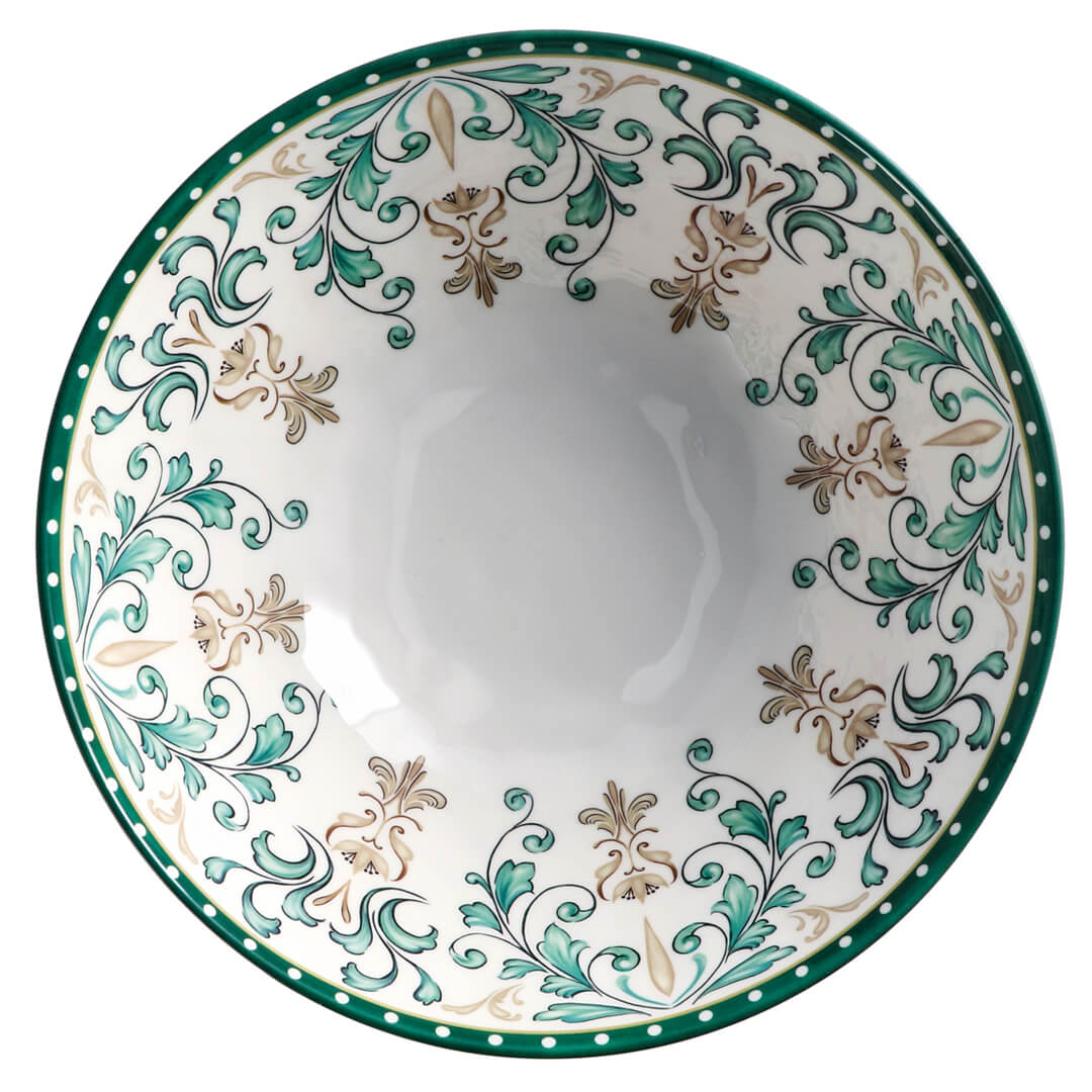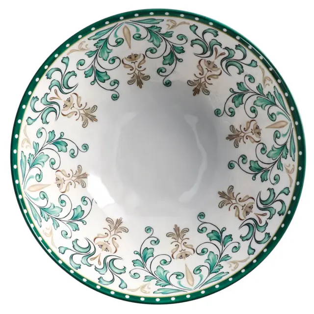 Elegantna skleda Kensy Floral s klasičnim dekorativnim vzorcem v zelenih tonih je popolna za postrežbo solat, sadja ali prigrizkov na prostem. Njen čudovit dizajn spominja na tradicionalno keramiko, vendar je izjemno lahka in odporna, zato je idealna za piknike, kampiranja ali druge aktivnosti na prostem. Izdelana je iz trpežnega melamina, ki je lahek in odporen na udarce. Skleda ni primerna za uporabo v mikrovalovni pečici in pomivanje v pomivalnem stroju. Je odlična izbira za vse, ki želijo funkcionalnost in prefinjen videz – tudi zunaj doma.