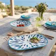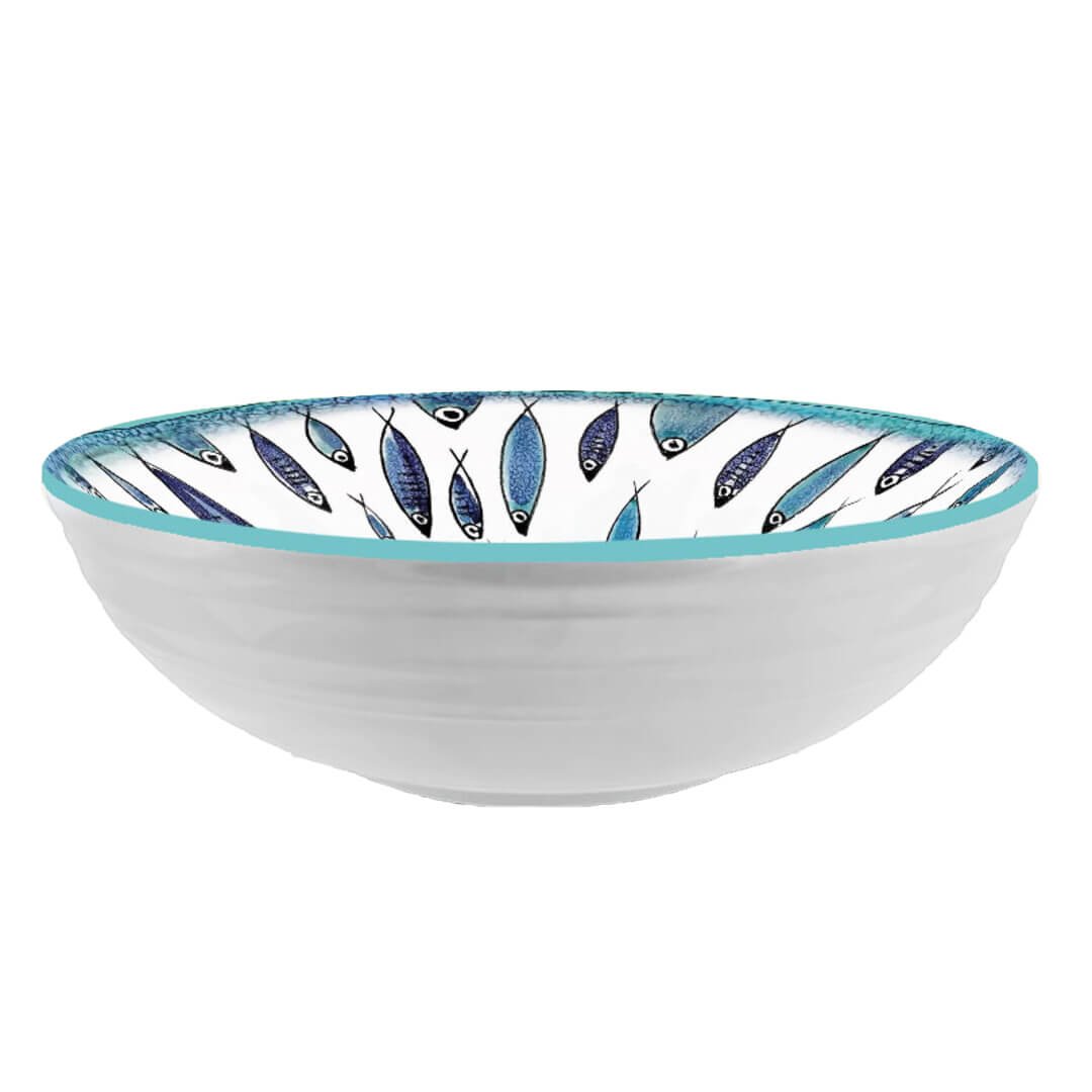 Okrogla skleda Arca Sarda (sardinska barka) je kot nalašč za poletne dni, saj v njej lahko postrežete različne juhe, ribji brodet in različne solate. Izdelana je iz umetnega materiala melamin, ki je odporen na udarce in zato idealen za uporabo na prostem (piknik, plaža, rojstni dan…). Skledo premera 28 cm krasi moder rob nepravilne oblike in motiv ribic. Primerna je za pomivanje v pomivalnem stroju. Dopolnite jo še z ostalimi izdelki iz iste linije Sarda in popestrite poletne jedi.