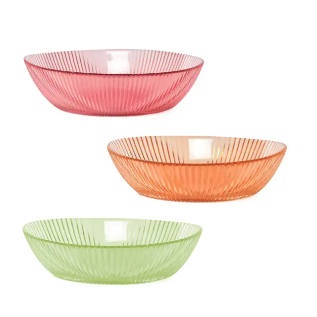 Elegantna ovalna skledica Pomlad je izdelana iz barvnega stekla s črtastim vzorcem in prinaša svežino na vsakodnevno mizo, obenem pa ostaja dovolj prefinjena za posebne priložnosti. Primerna je za stik z živili in pomivanje v pomivalnem stroju. Je odlična izbira za serviranje sladoleda ali pudinga, oreščkov in drobnih prigrizkov, koščkov sadja, ter manjših sladic ali hladnih predjedi. Popestrite mizo s steklenim izdelkom, ki združuje barvitost, funkcionalnost in brezčasno eleganco. Na voljo je v več barvah.