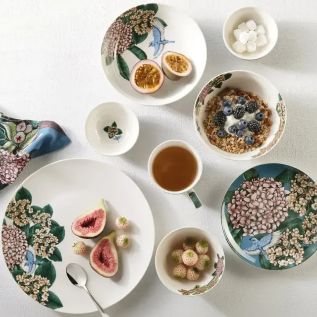 Okrogla servirna skledica Reminisce Floral, premera 16 cm, je bil zasnovana v sodelovanju z umetnico Nehe Gupte, znane kot Blck Pen iz Sydneyja. Izdelana je iz keramike v modrem odtenku z veličastnim dizajnom bujnega cvetja hortenzij in listja v umetničinem značilnem slogu akvarela in črnila. Primerna je za postrežbo prilog, predjedi in sladic. Skledica je privlačen kos s katerim lahko popestrite preprost ali nevtralen interior ter vnesete svežo eleganco. Z dramatično temno paleto združuje svež, sodoben slog z romantiko klasičnega cvetja – čudovita ideja za darilo. NAMIG: Dopolnite jo še z ostalimi izdelki iz iste zbirke Reminisce, ki ponuja vrsto predmetov, vključno s krožniki in skledami, ki se ponašajo s kontrastnim učinkom, ustvarjenim s temeljno surovo keramiko Stoneware v kombinaciji z glazuro visokega sijaja.