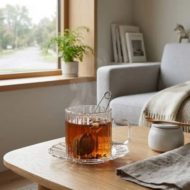 Skodelica za čaj Luce s priloženim podstavkom oziroma krožnikom združuje preprostost, eleganco in praktičnost. Izdelana je iz kakovostnega borosilikatnega stekla s črtasto reliefno površino, ki ustvarja zanimiv vizualni učinek in skodelici daje sodoben, prefinjen videz. S prostornino 250 ml je idealna za postrežbo različnih vrst čaja, toplih napitkov ali zeliščnih poparkov. Priložen podstavek dopolnjuje celoten videz ter omogoča priročno odlaganje čajne žličke ali čajne vrečke. Skodelica je primerna za uporabo v mikrovalovni pečici in za pomivanje v pomivalnem stroju, zato je praktična tako za vsakodnevno uporabo kot tudi za prijetne trenutke ob skodelici čaja.