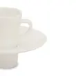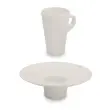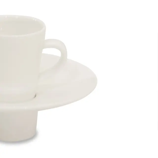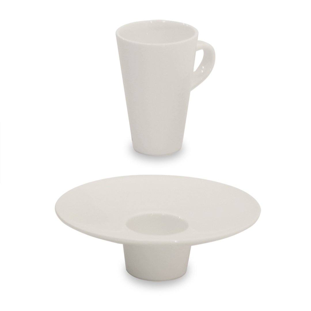Moderno zasnovana skodelica za kavo je izdelana iz kakovostnega porcelana umazano bele barve. Ponaša se s prostornino 100 ml in podstavkom, v katerega lahko postavite skodelico. Z nevsakdanjo skodelico boste zagotovo očarali goste. Primerna je za uporabo v mikrovalovni pečici in pomivanje v pomivalnem stroju.