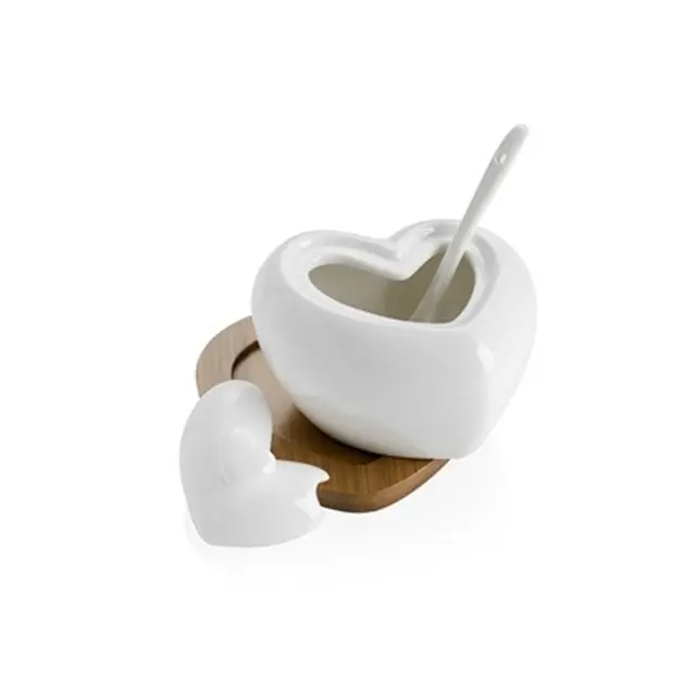 Posoda za sladkor (sladkornica) je nepogrešljiv pripomoček v vsaki kuhinji, uporabna zjutraj pri zajtrku, nepogrešljiva pri postrežbi kave gostom in prijateljem ter praktična pri pripravi tort in sladic. Brandanijeva srčasta skledica z edinstvenim in prefinjenim dizajnom je izdelana iz porcelana. Okrogla, prostorna in praktična skledica s pokrovom in žličko je uporabna tudi za serviranje omak ali parmezana. Podstavek iz bambusovega lesa je lep stilski dodatek, ki okrasi in polepša vsako mizo! Lahko je lepo darilo.