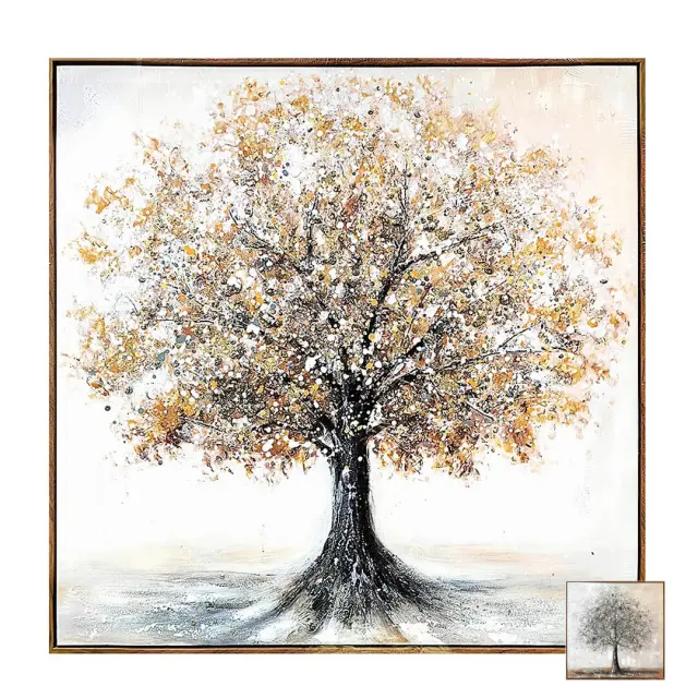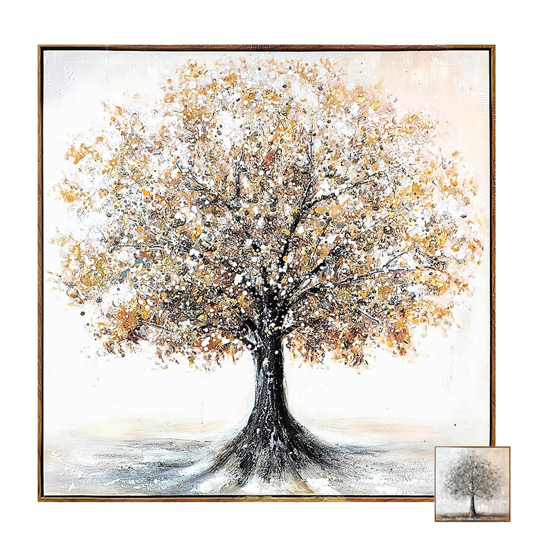 Kvadratna slika na platnu z okvirjem dimenzije 80 x 80 cm je izrazit dekorativni kos, ki prostoru doda globino in značaj. Motiv naslikanega drevesa simbolizira moč, rast in povezanost z naravo, zato v dom prinaša občutek miru ter harmonije.