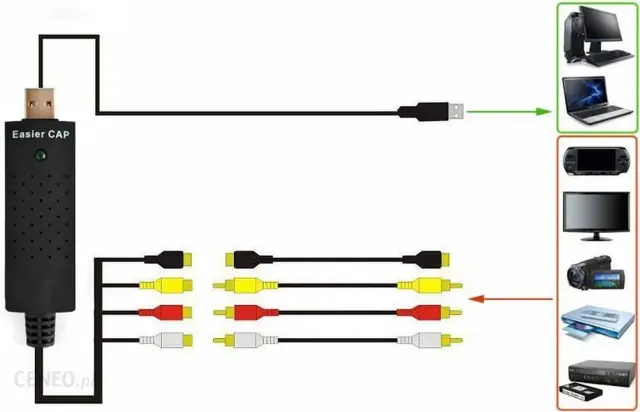 Prepričajte se tudi, da videorekorder ali videokamera predvaja video standard, v katerem je bila posneta kaseta (PAL, SECAM, NTSC).Priložen je set vtičnic za priklop videorekorderja, USB vtič za komunikacijo z osebnim računalnikom in preprost program za zajem in urejanje posnetkov.