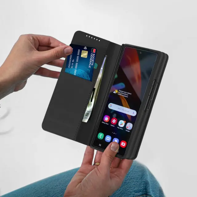 Popolna zaščita, zasnovana posebej za Samsung Galaxy Z Fold 3. Sestavljena iz pokrova denarnice, magnetnega hrbtnega pokrova in okvirja za zaščito sprednjega zaslona. Magnetno ohišje je mogoče kadar koli odstraniti in uporabiti posamično. Opremljen s prostorom za shranjevanje kartic in stransko denarnico.