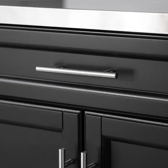 Odličen je z veliko delovno površino iz nerjavečega jekla, 1 predalom, 1 držalom za brisače, 1 stransko kaščo za začimbe in 1 po višini nastavljivo odlagalno polico.