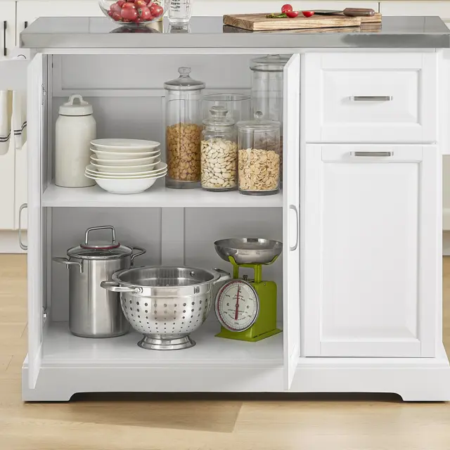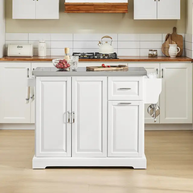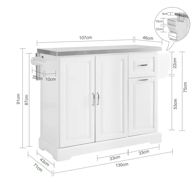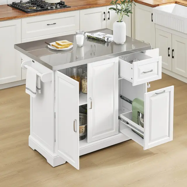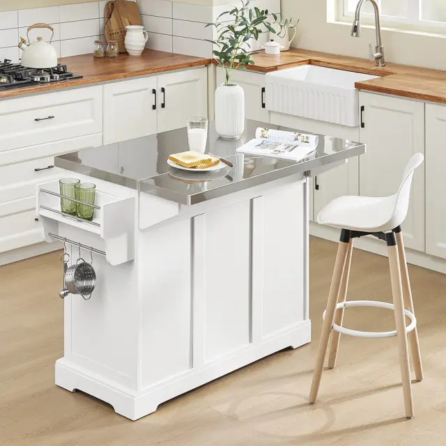 SoBuy kuhinjski otok na kolesih z raztegljivo mizo, omarico, 2 predaloma, nastavljivo polico, Bela