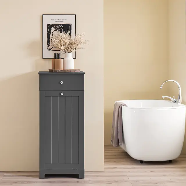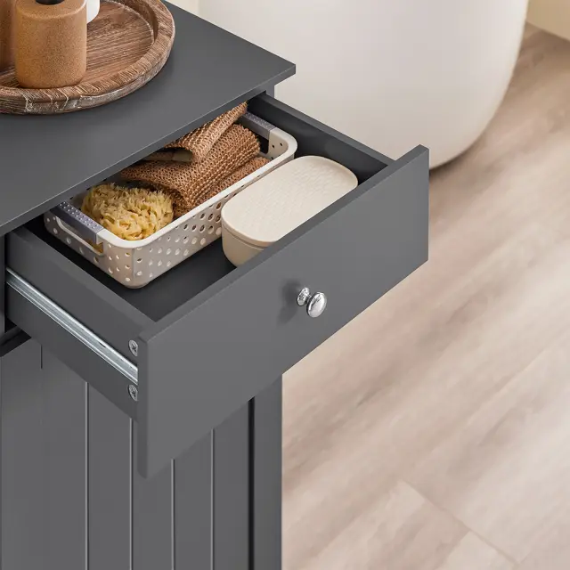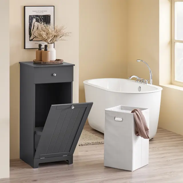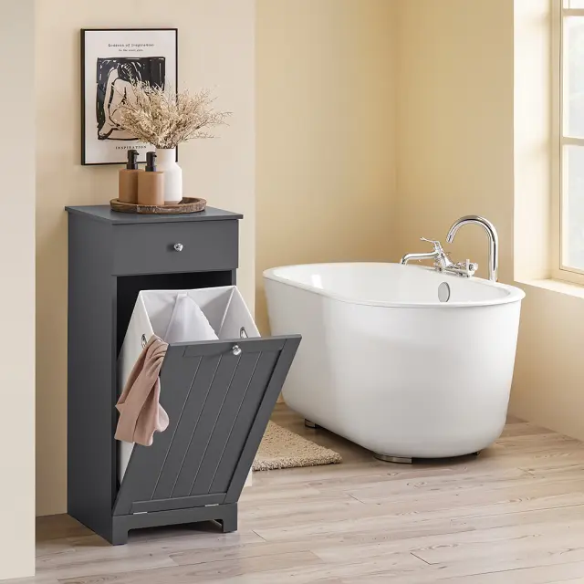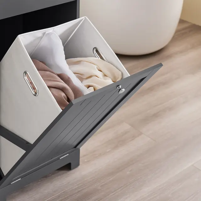 Odkrijte temno sivo omaro za pralni stroj, ki združuje elegantno obliko in praktično funkcionalnost za vašo kopalnico ali pralnico.