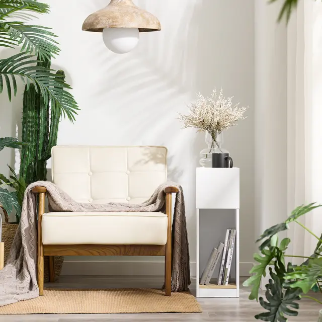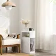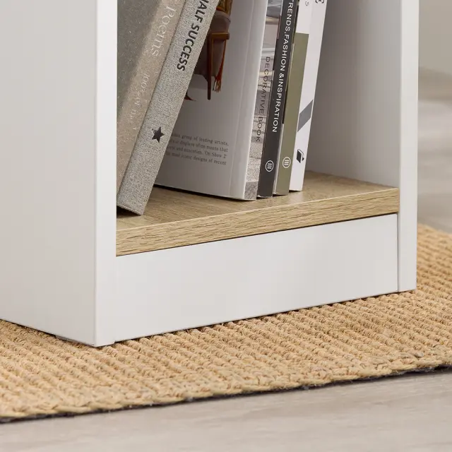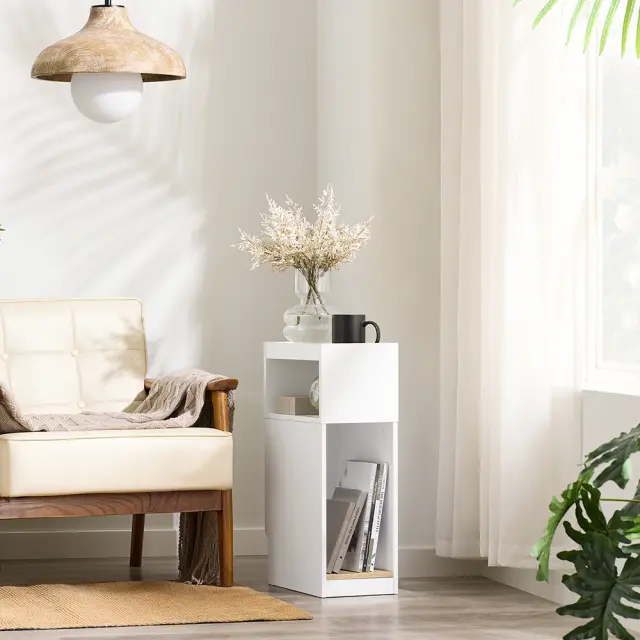 Zasnova omarice omogoča prilagodljivo shranjevanje v različnih okoljih. Odprta spodnja polica je primerna za knjige ali okrasne predmete, zgornja polica z dvignjenimi robovi pa varno drži manjše predmete.