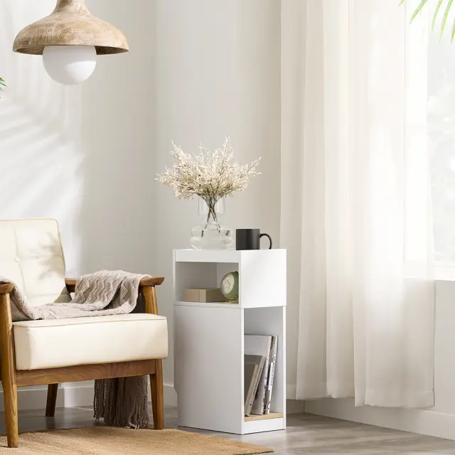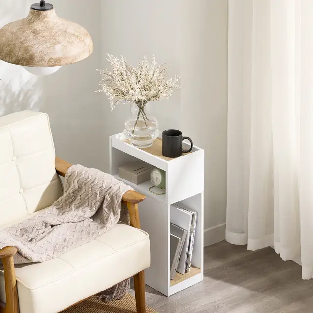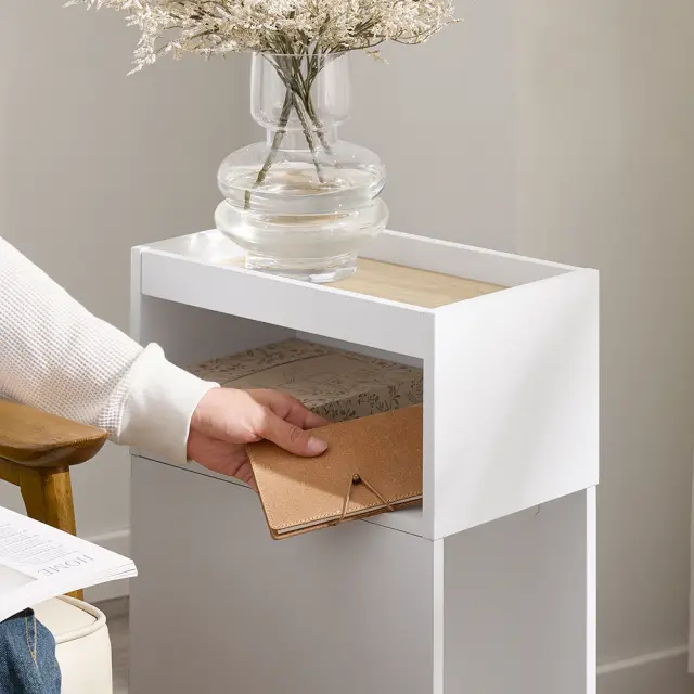 Ozka nočna omarica z dodatki za shranjevanje je popolna rešitev za majhne prostore.