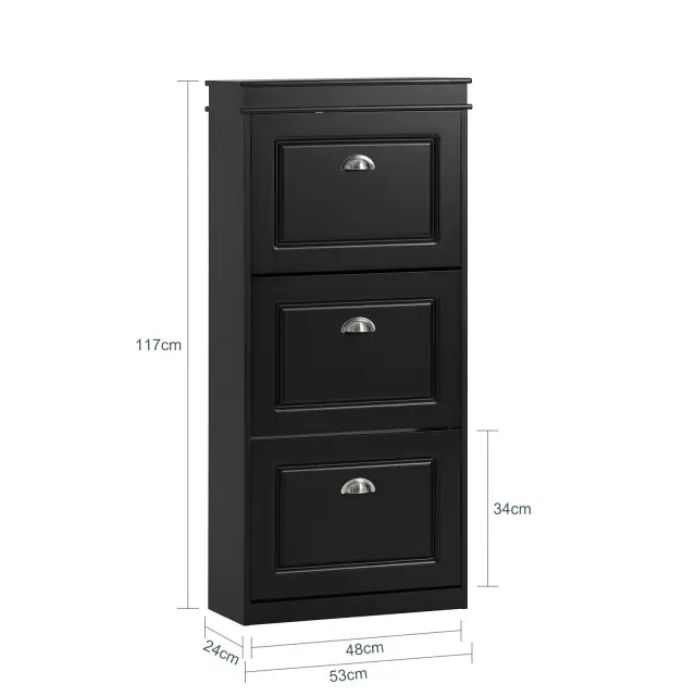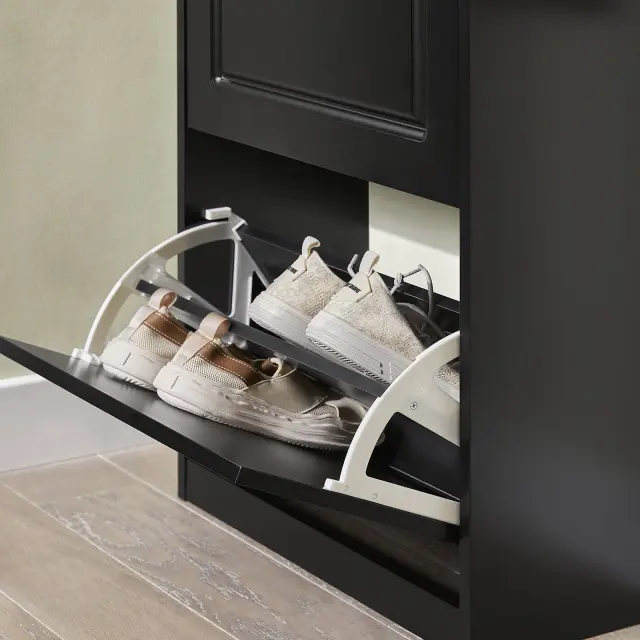 Zagotavlja predal za shranjevanje čevljev s tremi preklopnimi predali. Za vsak predal sta na voljo 2 vrsti prostora.