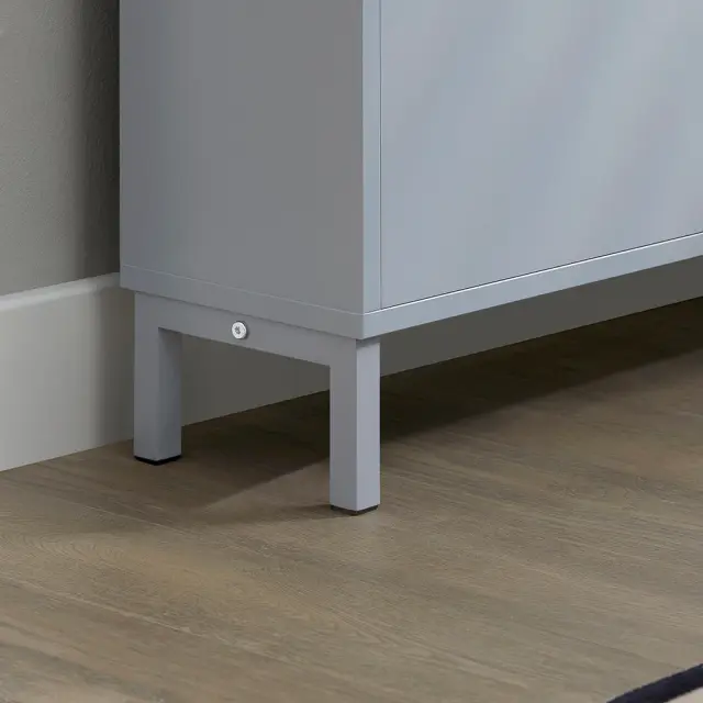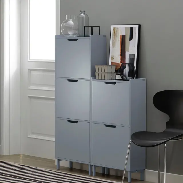 Moderno oblikovana omara za čevlje v sivi barvi se bo odlično ujemala z vsakim domačim dekorjem.