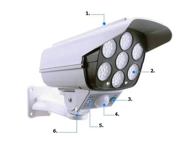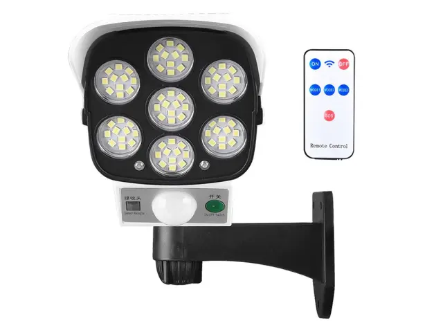 Kakovostna kamera je naprava, ki se napaja iz sončne plošče, ki zagotavlja razsvetljavo brez dodatnega vira energije. Opremljen je z zelo svetlo ploščo 77 LED COB točk z močnim svetlobnim tokom.