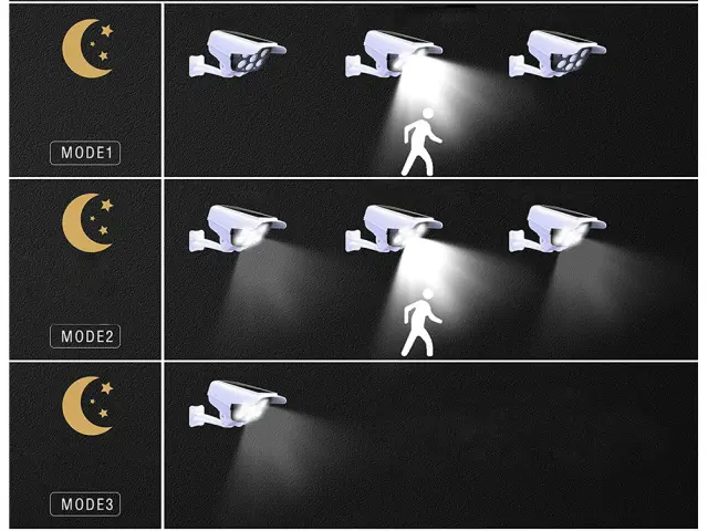 2. LED-ji v kameri ves čas svetijo pri 50% moči, ob zaznavi gibanja pa minejo 100% moči, ko ni gibanja, se kamera vrne v stanje pripravljenosti in prižge do 50% moči. Avtomatsko vklopljen po mraku in izklop ob zori.