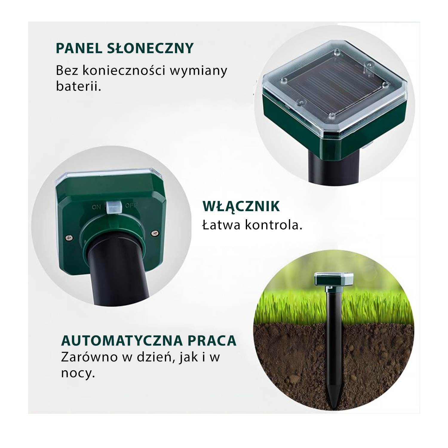 SOLARNI ODGANJALEC KRTOV IN GLODAVCEV KOMPLET 2 Uživajte v lepem in zdravem vrtu brez škodljivcev zahvaljujoč setu solarnih repellerjev Bass Polska! Pozabite na poškodovane rastline in nadležne glodalce. Inovativni solarni odganjalci glodavcev uporabljajo sončno energijo za učinkovito odganjanje škodljivcev, hkrati pa zagotavljajo varnost ljudi in živali. Zahvaljujoč velikemu območju delovanja bo vaš vrt popolnoma zaščiten 24 ur na dan. Namestite naše solarne odganjalce krtov in uživajte v miru in lepoti svojega vrta! Prednosti odganjalcev škodljivcev Bass Polska so: Odganjalci oddajajo kombinacijo zvokov in tresljajev, ki učinkovito odvračajo škodljivce, kot so krti, voluharji, miši in drugi glodavci, škržati in podlasice. Na sončno energijo: sončni odganjalci škodljivcev delujejo na sončno energijo, kar odpravlja potrebo po zamenjavi baterij in zmanjšuje obratovalne stroške. Varno za ljudi in živali: uporabljajo ultrazvok in vibracije, ki so neškodljive, a učinkovite pri odganjanju škodljivcev – popolna sredstva za odganjanje krtov. Veliko območje delovanja: sončni odganjalci škodljivcev za vrt ščitijo območje v radiju 8-15 metrov. Vodotesen in odporen na vremenske vplive: zanesljivo delovanje tudi v deževnih dneh. Enostavna namestitev in upravljanje, le postavite odganjalce na pravo mesto na vrtu. Estetsko oblikovanje: diskreten videz, ki ne moti estetike vašega vrta. Mere: višina 37 cm, širina plošče 9 cm.