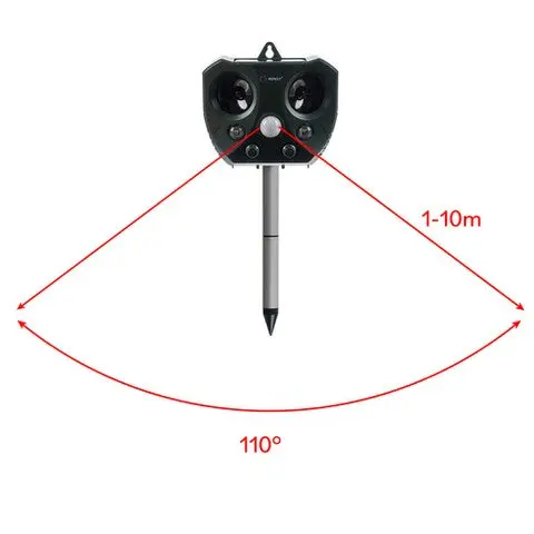 DVOJNI ZVOČNIKIN SVETLOBNI SIGNAL- pravilno nastavljeni zvočniki so prilagojeni za oddajanje za živali neprijetnih ultrazvočnih valov.Poleg tega je odganjalec opremljen z LED diodami, ki dajejo bel in rdeč svetlobni signal.