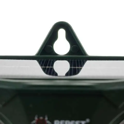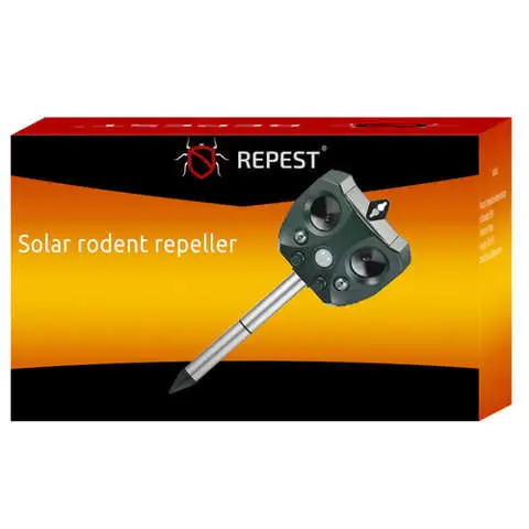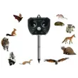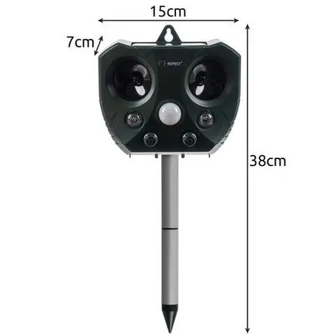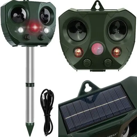 SPECIFIKACIJA -napajanje: solarno in omrežno;plastika (ABS);delovni cikel: ?30 sekund;solarni panel: polisilicij 4,3 V, 20 mAh;ultrazvok v območju 13,5–45,5 kHz;5 načinov delovanja: 1: 13,5 kHz-20 kHz za odganjanje živali, kot so miši, podgane, psi, lisice itd. 2: 15,5 kHz-25 kHz za odganjanje živali, kot so mačke, rakuni, jazbeci, skunki itd. 3: 25 kHz- 34,5 kHz za odganjanje živali, kot so netopirji, ptice, glodalci itd. 4: Močne utripajoče luči za odganjanje živali, kot so rakun, divji prašič, kuna itd. 5: 13,5 kHz-40 kHz - vse zgoraj našteto + močni utripi LED;vgrajena baterija: 3 x 800mAh;možnost polnjenja preko USB priključka (kabel priložen);kot senzorja: 110 stopinj;domet senzorja gibanja: 8-10m (odvisno od velikosti živali);možnost montaže v tla, na ograjo, na steno;vodoodporen: IP55;dimenzije: 15x7x38cm;teža: 400 g;teža v paketu: