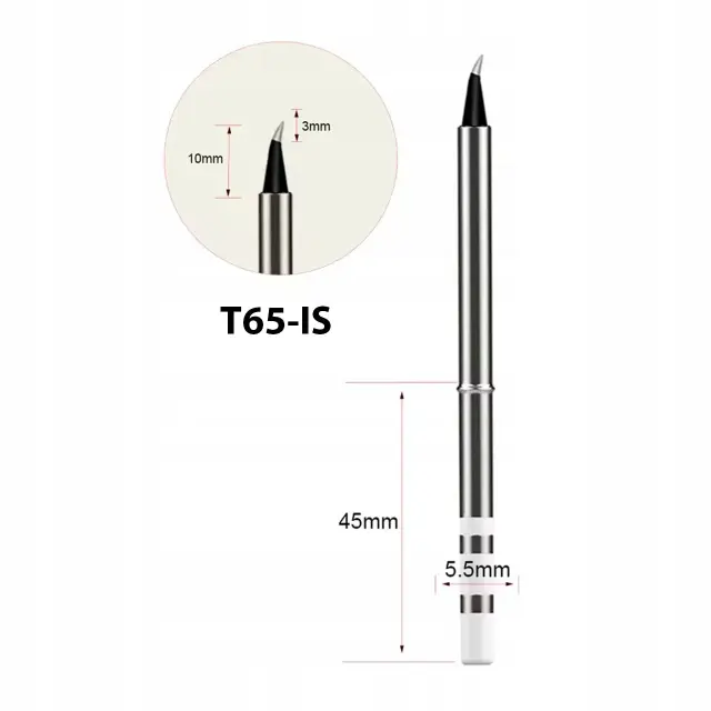 Konica T65-IS je tanka konica z ostro iglo premera 3 mm in delovne dolžine 10 mm. Zasnovan je za maksimalno natančnost in je idealen za delo z zelo drobnimi integriranimi vezji, mikroelementi ter pri servisiranju mobilne elektronike. Njegov tanek, natančen profil zagotavlja odlično vidljivost mesta spajkanja in nadzor nad vsako točko stika.