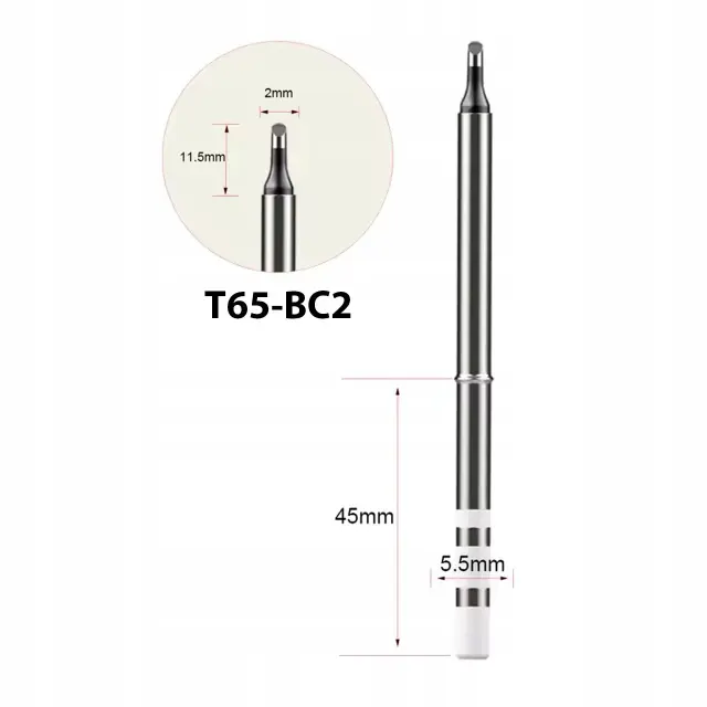Model T65-BC2 je natančna stožčasta konica s kroglastim zaključkom s premerom 2 mm in delovno višino 11,5 mm. Odlično se obnese pri spajkanju elementov tipa SMD ter pri točkovnem nanašanju kositra. Njegova oblika omogoča natančno nadzorovanje količine spajka, kar je ključnega pomena pri delu z gosto zapolnjenimi tiskanimi vezji in občutljivimi elektronskimi komponentami.