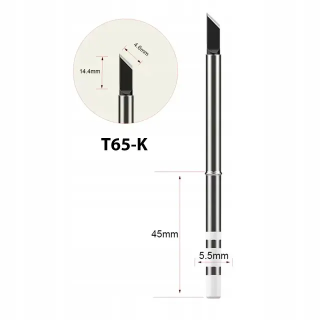 Spajkalni nastavek T65-K je klasičen nastavek tipa»odrezano rezilo« s širino 4,6 mm in višino 14,4 mm. Zaradi poševnega zaključka je idealno primeren za hiter prenos toplote in spajkanje večjih površin ter vodnikov. Zagotavlja natančnost in udobje pri operacijah, ki zahtevajo natančno vodenje spajka, njegova konstrukcija pa omogoča enostavno oblikovanje spajkalnih poti.