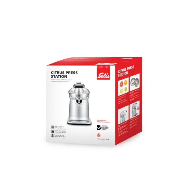 Citrus Press Station je kompaktne oblike in ga lahko shranite v zaprtem položaju, kjer ročaj ne štrli.