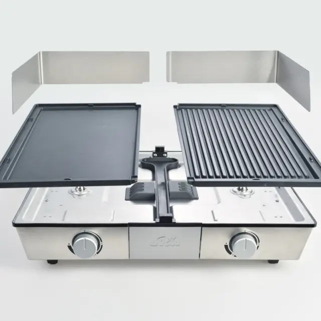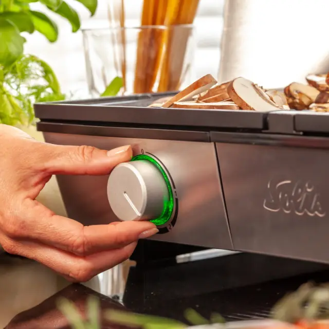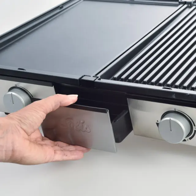 Nastavljiva temperatura, Skriti grelci, Pladenj za odvečno maščobo, Kontrolna lučka, Snemljiva plošča