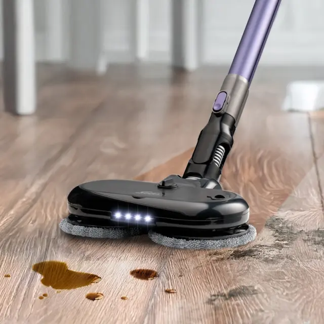 Umazanija se posesa, medtem ko vrteče se mokre blazinice za mop čistijo trda tla!