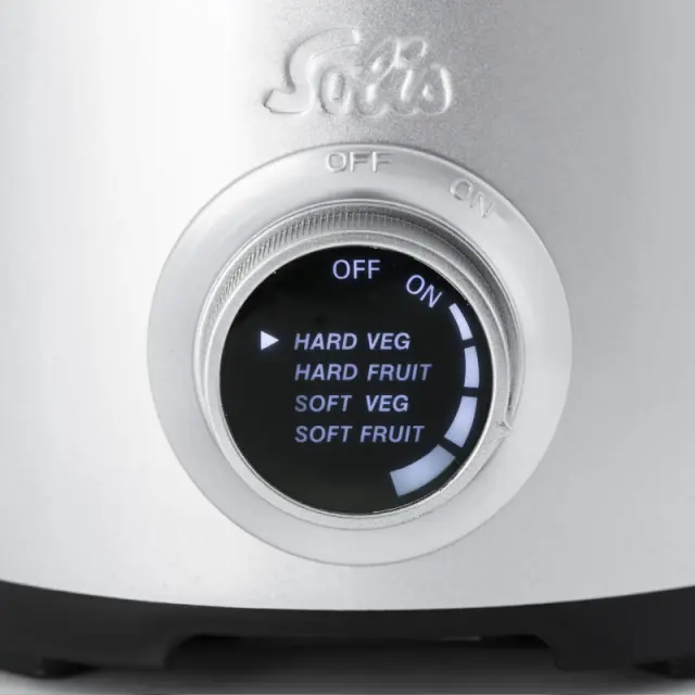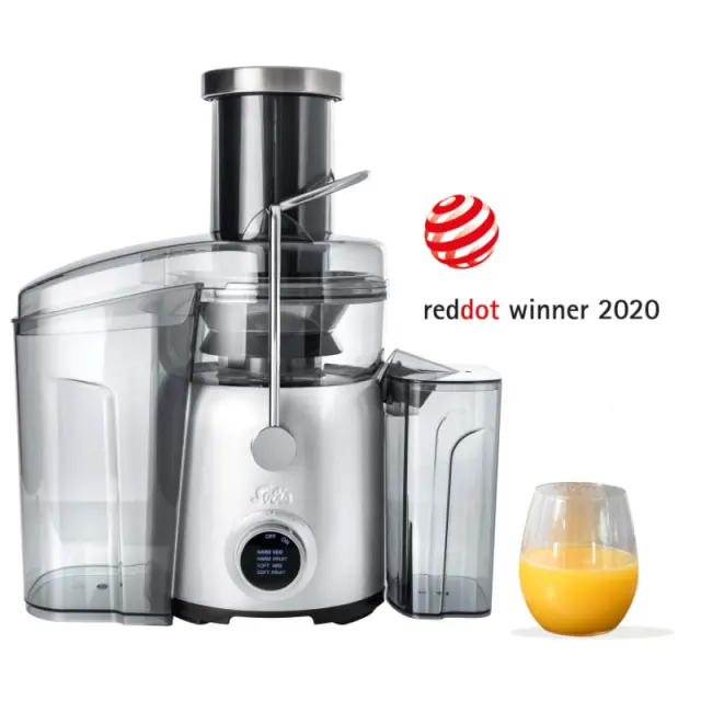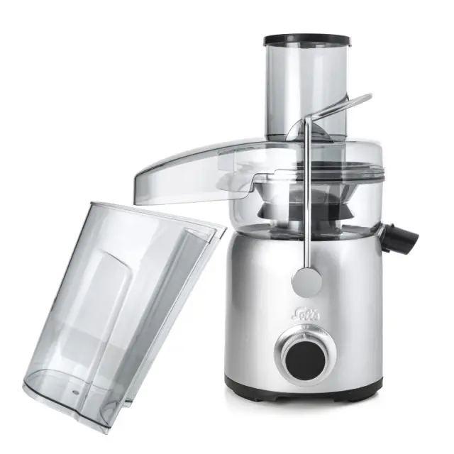 Ime Solis Juice Fountain Compact pove vse: ta sokovnik iz nerjavečega jekla je lep in kompakten, brez kompromisov glede kakovosti. Zasnovan je tako, da se lahko tako trdi kot mehki kosi sadja ali zelenjave hitro stisnejo v sok. Vrtljivi gumb vam omogoča izbiro želene hitrosti stiskanja, odvisno od kosa sadja ali zelenjave, s katerim napolnite skledo za sadje. Po stiskanju soka se lahko izliv posode za sok zapre, da preprečite kapljanje. Vrč za sok, ki se brezhibno poveže s sokovnikom, je enostavno odstranljiv.
