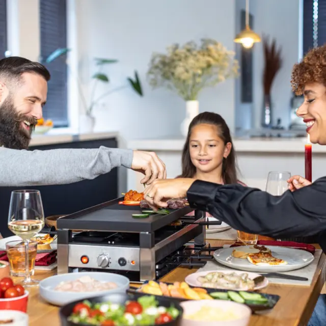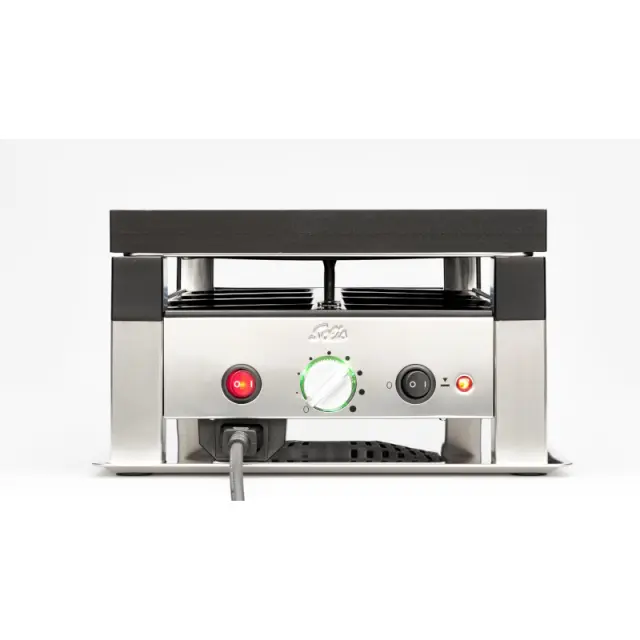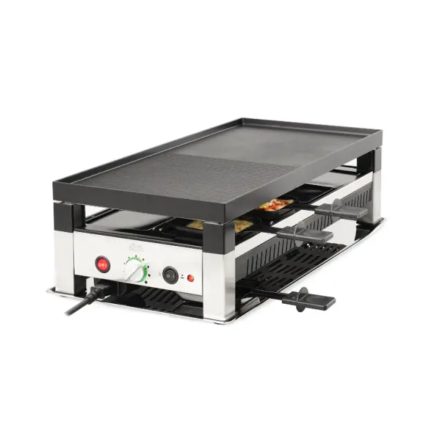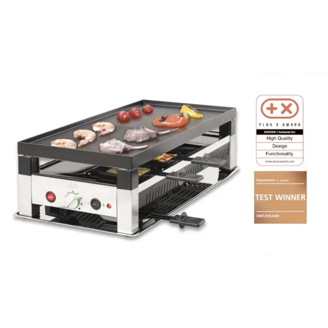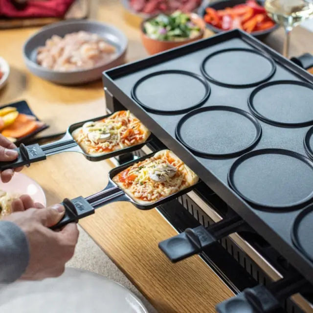 Solis Raclette & Pizza Grill for 8 večnamenski električni žar se lahko uporablja za pečenje mesa in zelenjave, peko palačink in mini pic, kot peč za raclette s švicarskim sirom.