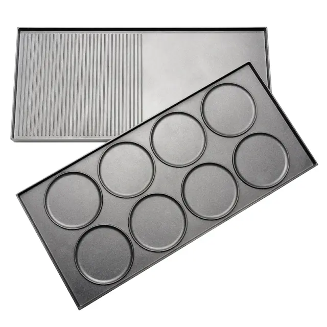 Večnamenska grill plošča za dvostransko uporabo, primerna za palačinke, meso in druge vrste jedi.