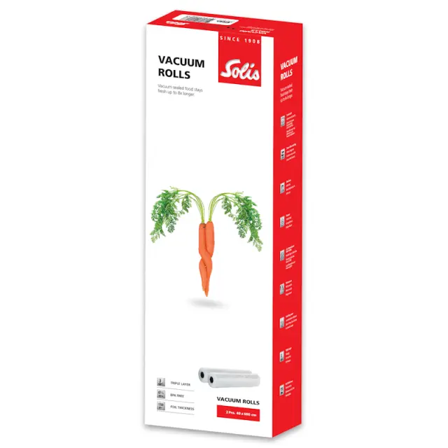 Vakuumske role 40×600 cm so na voljo v širini 40 cm, zaradi česar so primerne za uporabo z vakuumsko napravo Solis Vac Prestige Maxi. Vse, kar morate storiti je, da folijo odrežete na želeno dolžino, zaprete en konec vrečke, napolnite vrečko z želeno hrano in vakuumirate.